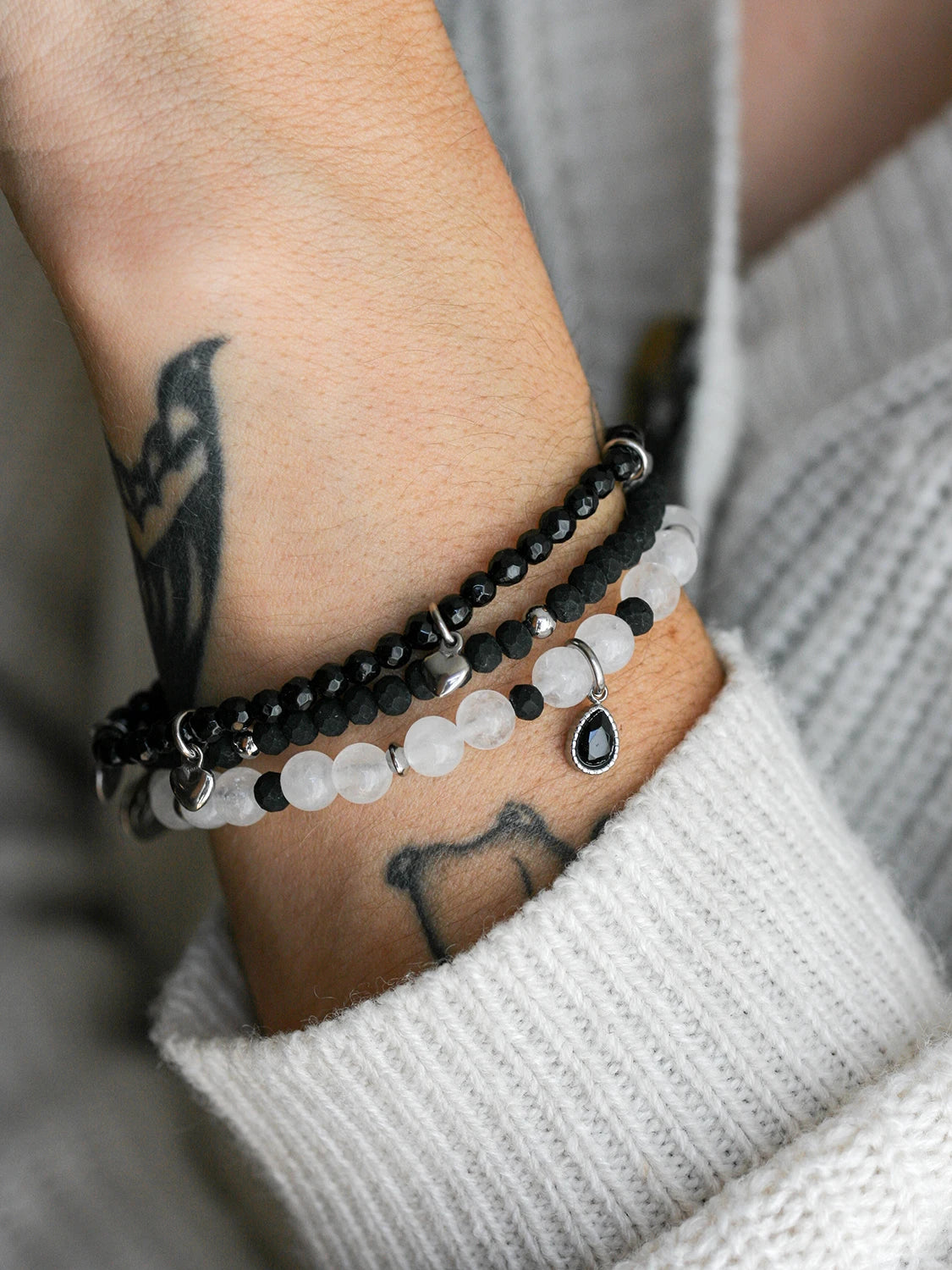 Il réunit de magnifiques cristaux noirs au fini mat et de fines billes en acier inoxydable argent, qui ajoutent un éclat subtil.