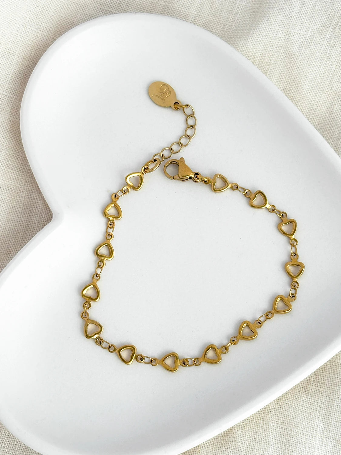 Orné de jolis cœurs minimalistes, ce bracelet apporte une délicate touche dorée. Il exprime à merveille le côté fleur bleue aux accents rebelles qui sommeille en toi.