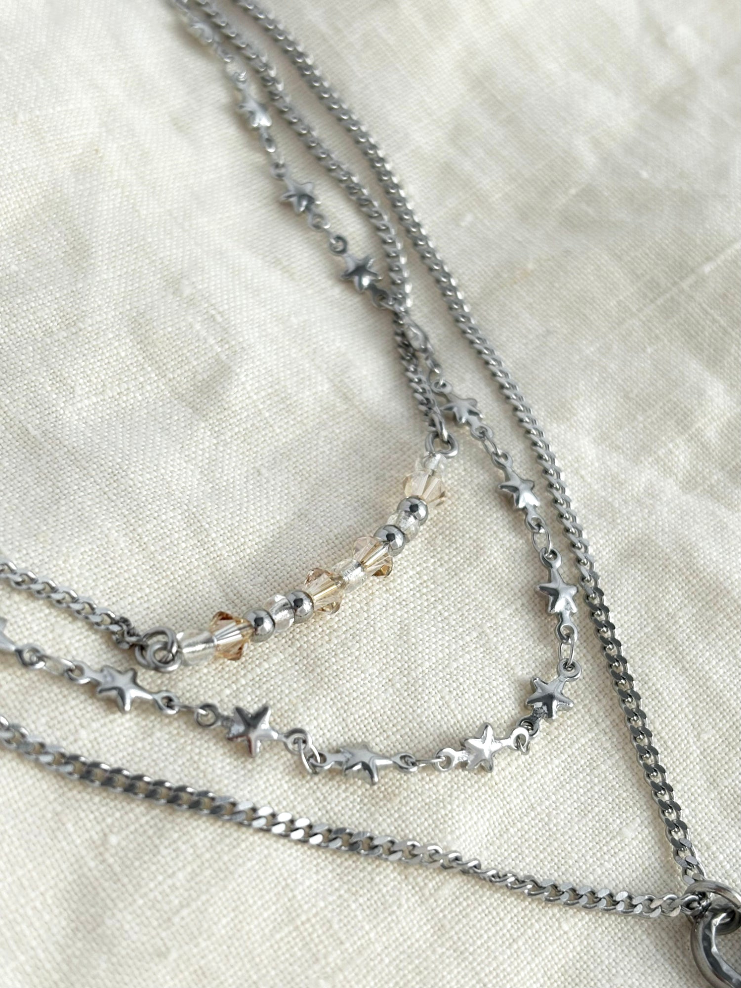 Voici LOCKA, un collier unique à trois rangs en acier inoxydable argent, à la fois raffiné et éclatant. Trois chaînes délicates s’entrelacent, une ornée de petites étoiles, tandis que la première brille de cristaux Swarovski de couleur champagne, et que la dernière se pare d’un pendentif cadenas en forme de coeur.
