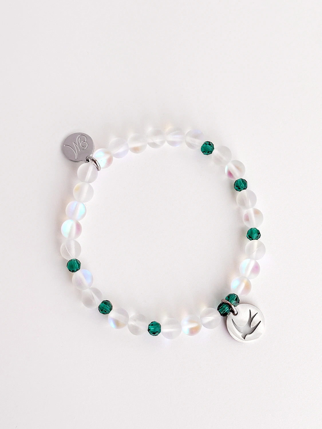Riche en sens et en profondeur, ce bracelet associe des perles effet Moonstone blanches à des cristaux vert sarcelle créant un magnifique jeu de lumière.