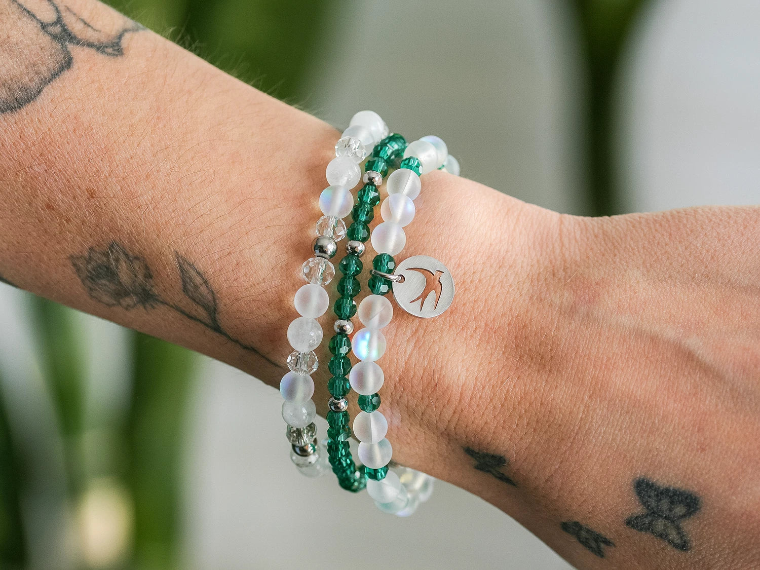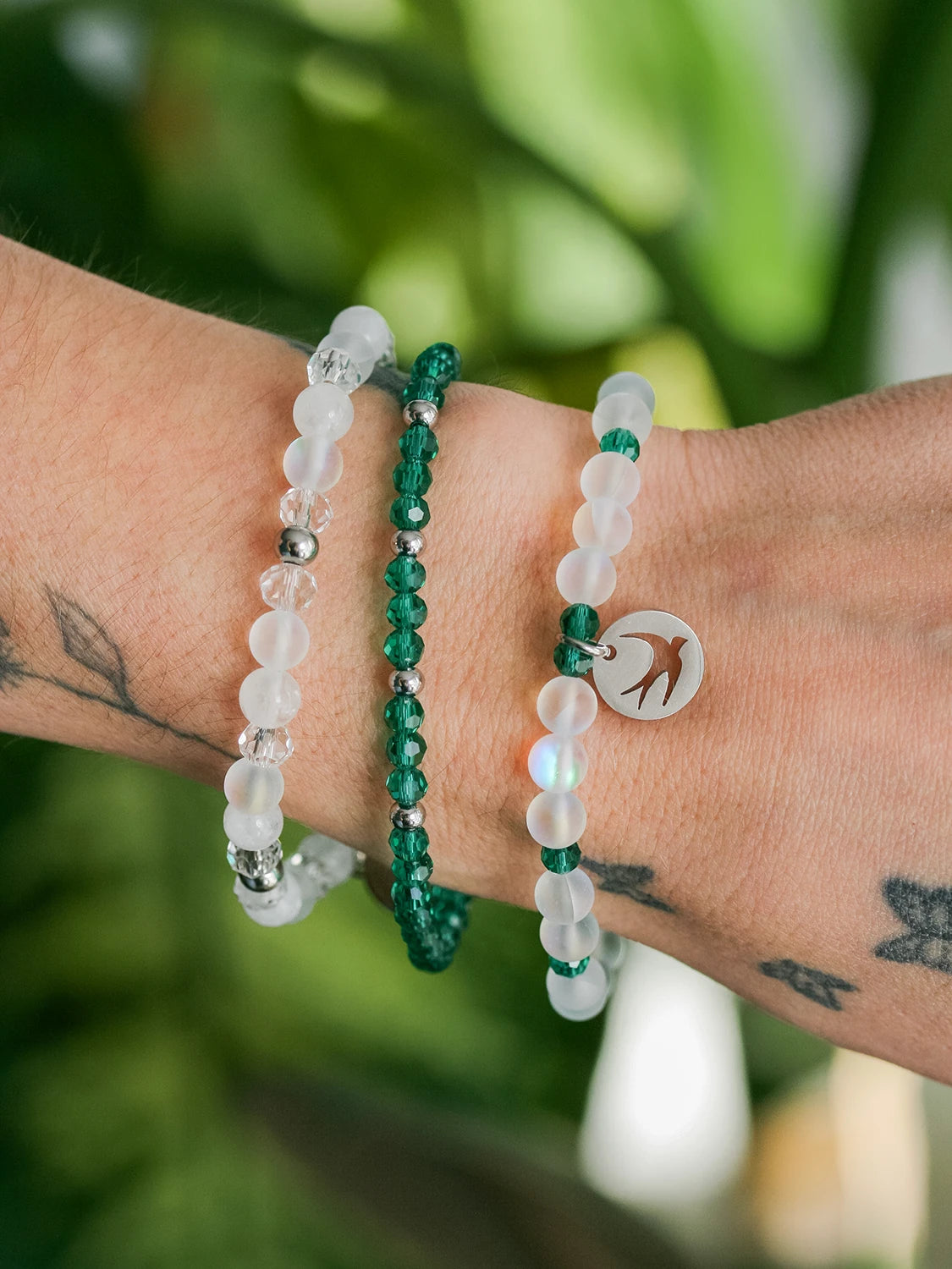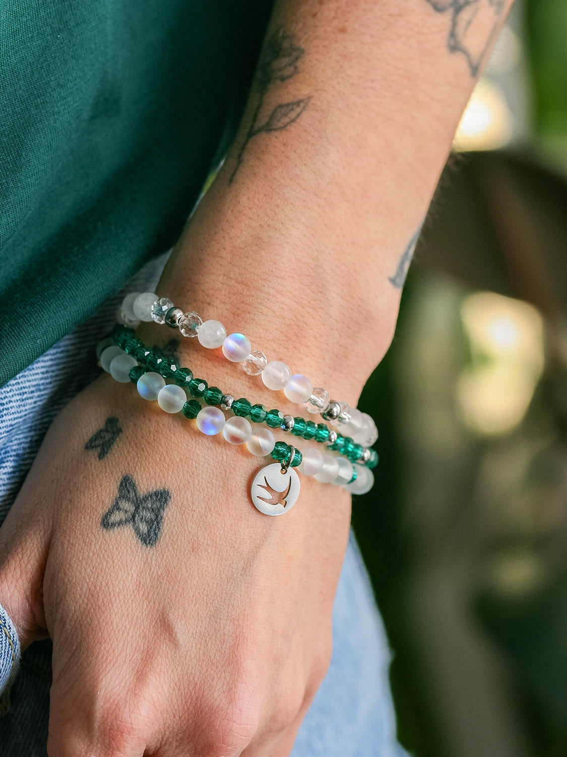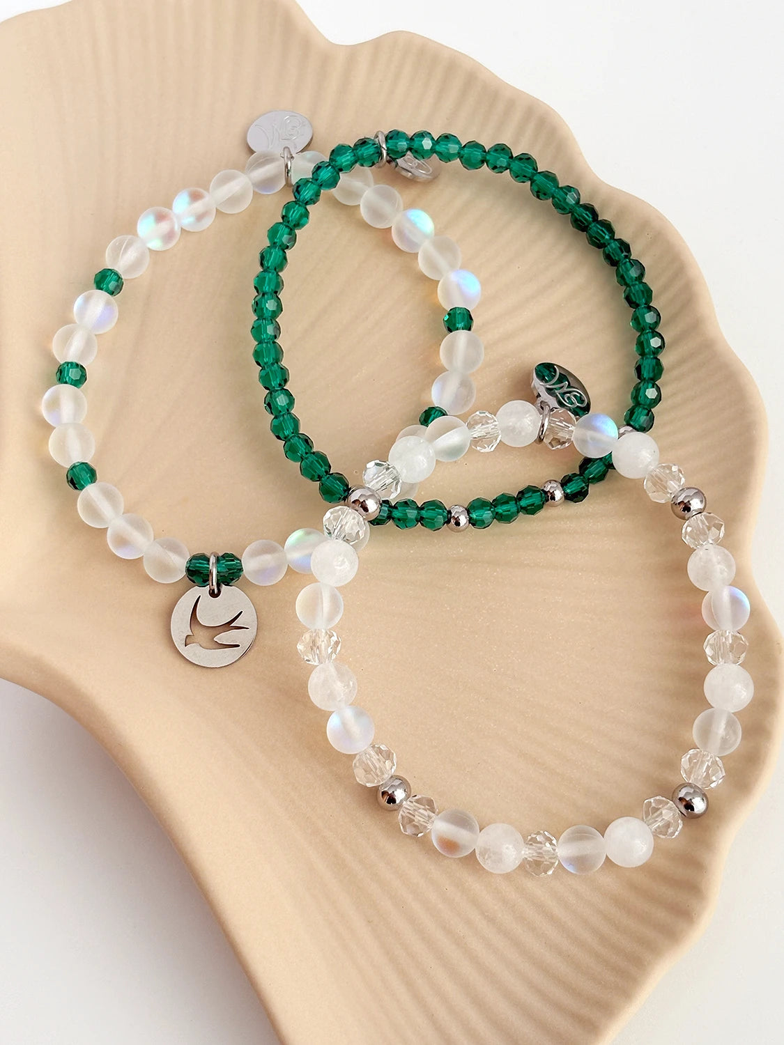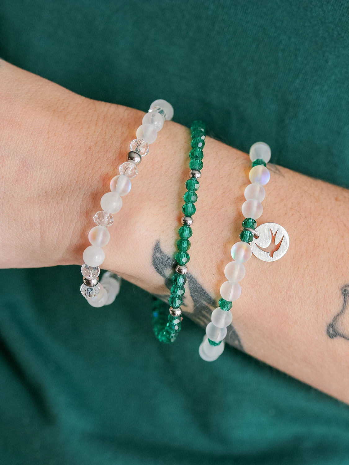 Ce trio de bracelets présente un contraste de blanc aérien et de vert sarcelle pour combler le besoin de se recentrer, de s’ancrer dans l’instant présent. Ses nuances, tantôt douces et apaisantes, tantôt profondes et transformatrices, transmettent une énergie nouvelle, tout en apportant une élégance intemporelle.