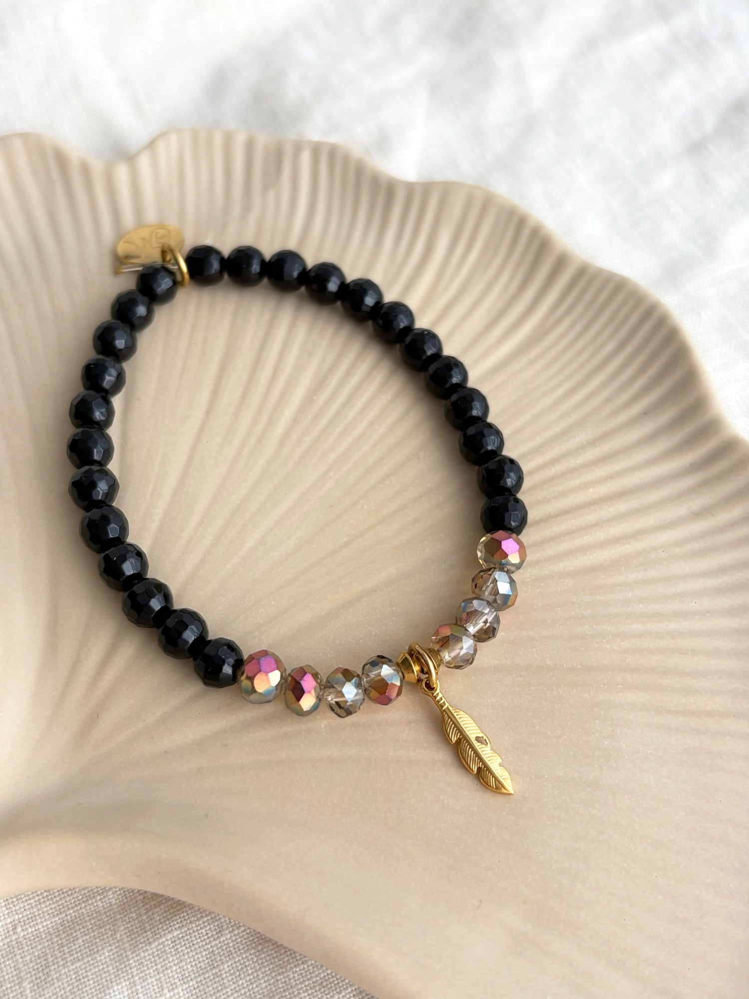 Voici le bracelet unique SYRKA ! Composé de pierres fines d’Onyx noir facetté 6 mm, il évoque profondeur, élégance et protection. À l’avant, une section de cristaux au fini brun sablé, sublimés par de délicats reflets aurore boréale, apporte lumière, chaleur et une touche de magie. Une breloque plume en acier inoxydable doré vient compléter le tout, ajoutant mouvement et légèreté.