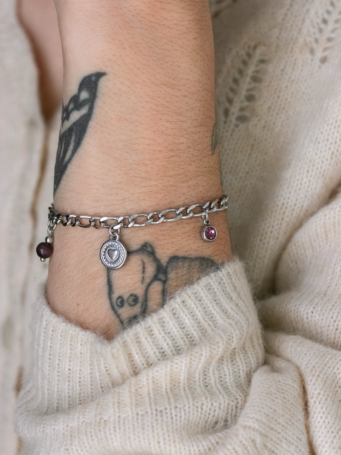 En plein dans la tendance des bracelets à charms, ce bijou en acier inoxydable argent se révèle une véritable amulette d’amour de soi.