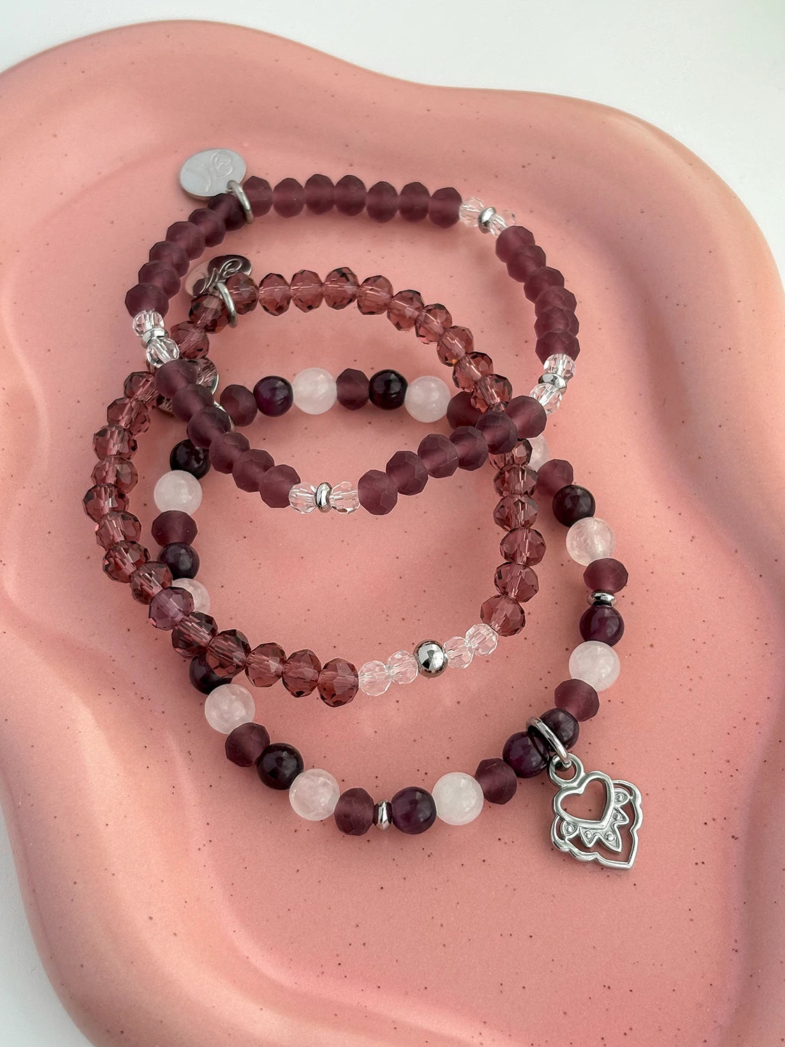 Tantôt profondes et mystérieuses, tantôt douces et lumineuses, les pierres mauves pourpre se mêlent aux cristaux et aux notes d’acier inoxydable argent pour captiver le regard.