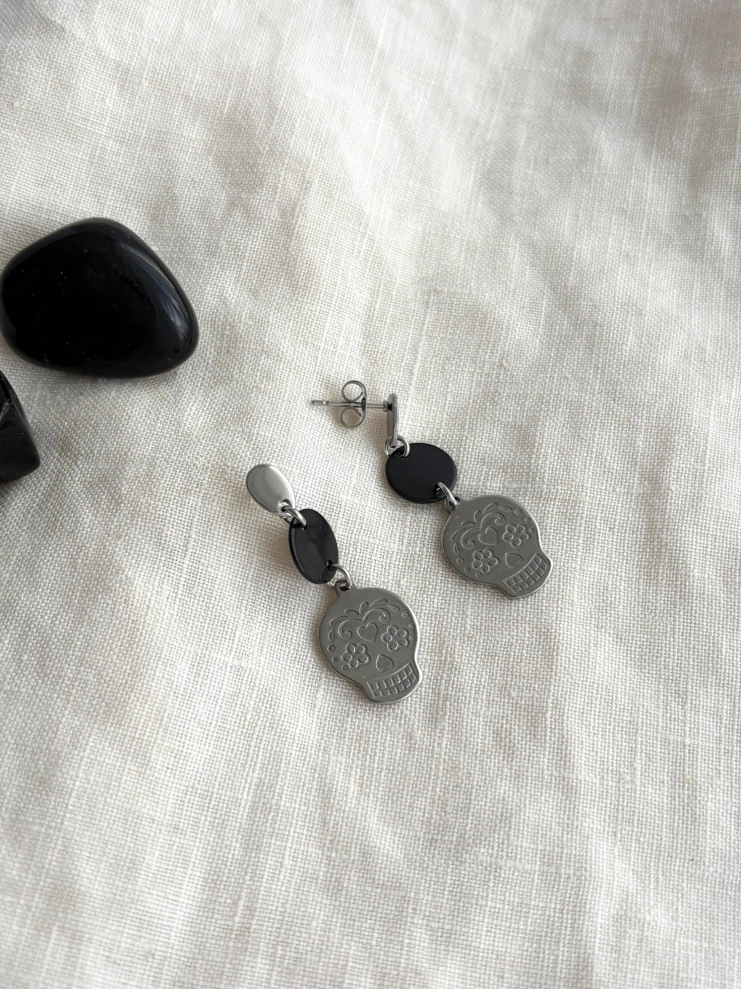 Voici les clous d'oreilles uniques KYRILLA! Élégantes et audacieuses, elles ajouteront une touche de caractère à ton look. Composées de clous d’oreilles en forme de goutte en acier inoxydable argent, de connecteurs circulaires en acier inoxydable noir et de breloques La Catrina, elles marient mystère et symbolisme à la perfection.