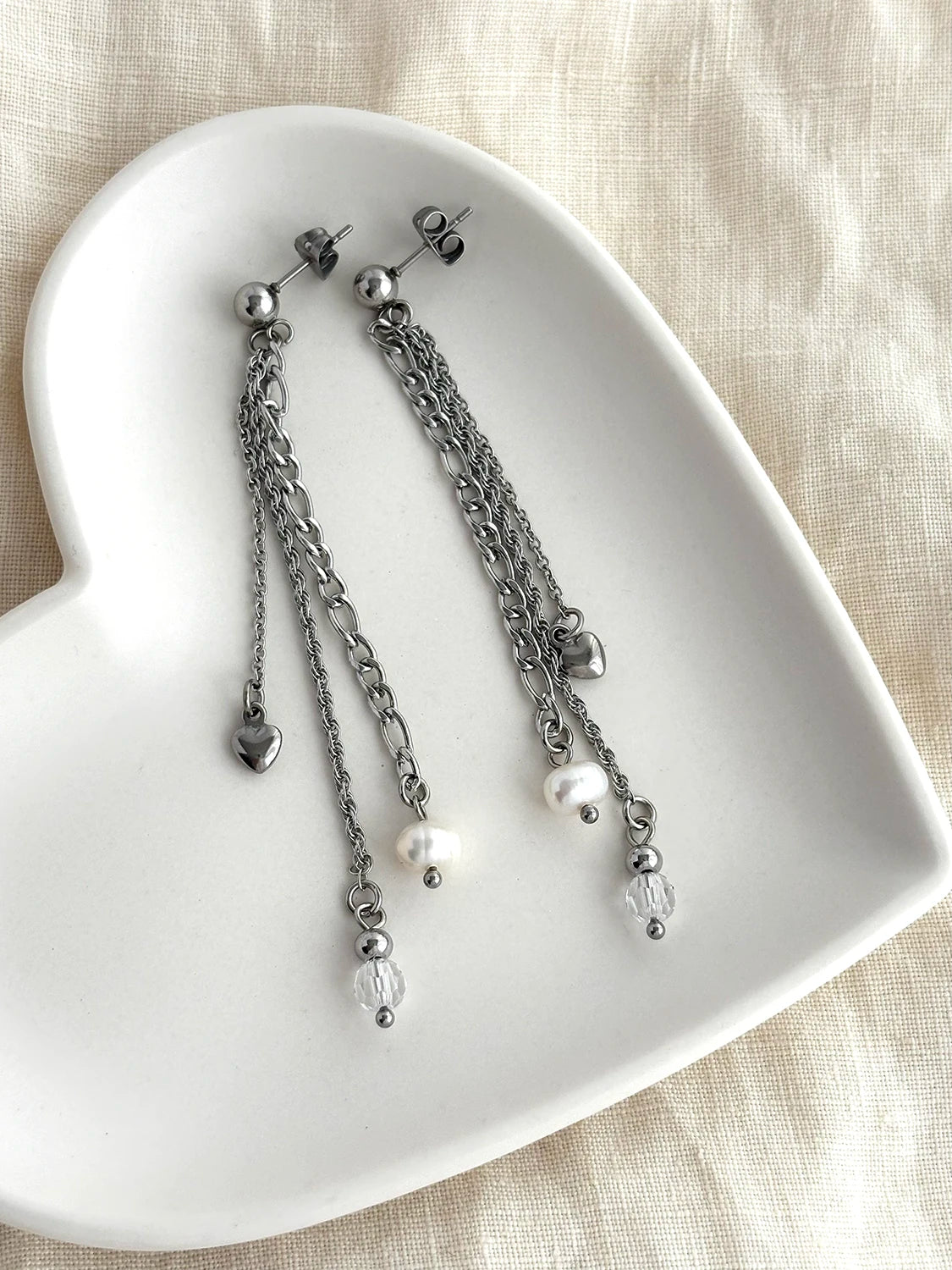 D’une délicate originalité, ces clous d’oreilles en acier inoxydable argent se composent de trois chaînes aux finis différents. Chacune met en valeur un détail unique : une perle d’eau douce, un cristal lumineux et un petit cœur en acier inoxydable argent. Une combinaison élégante qui apporte mouvement, éclat et charme à ton look, tout en restant intemporelle.