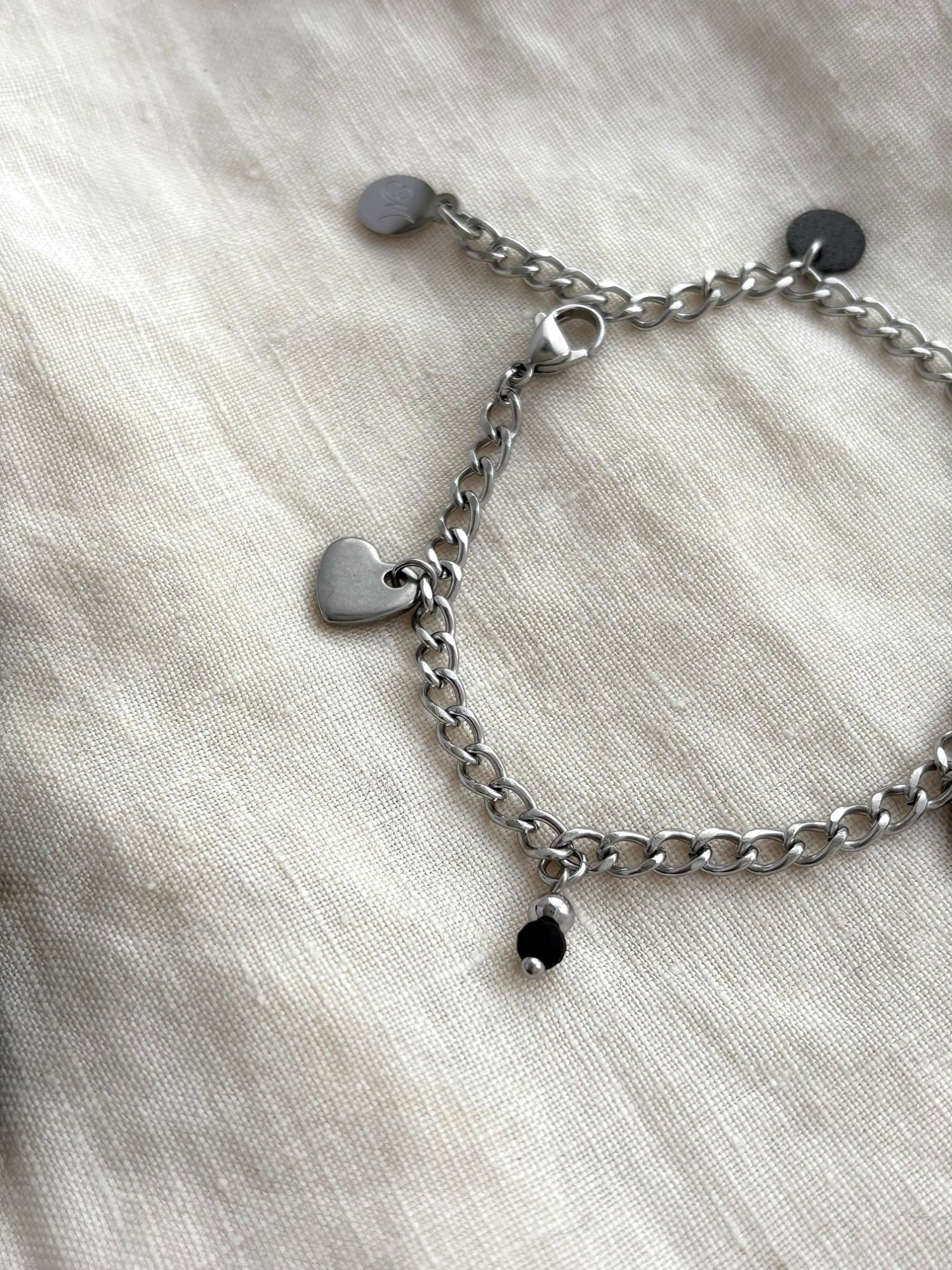 Voici le collier unique CYRCA, un bijou à la fois audacieux et raffiné! Celui-ci allie le charme intemporel de l’acier inoxydable argent à des accents noirs élégants. Sa chaîne massive est ornée de petits pendentifs symboliques créant un équilibre entre douceur et mystère.