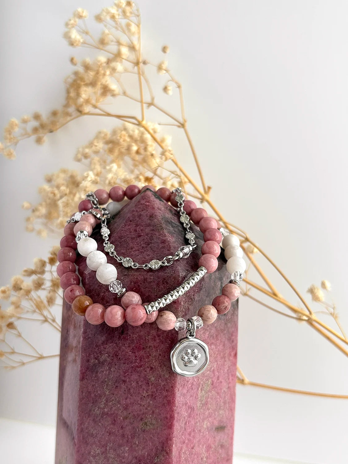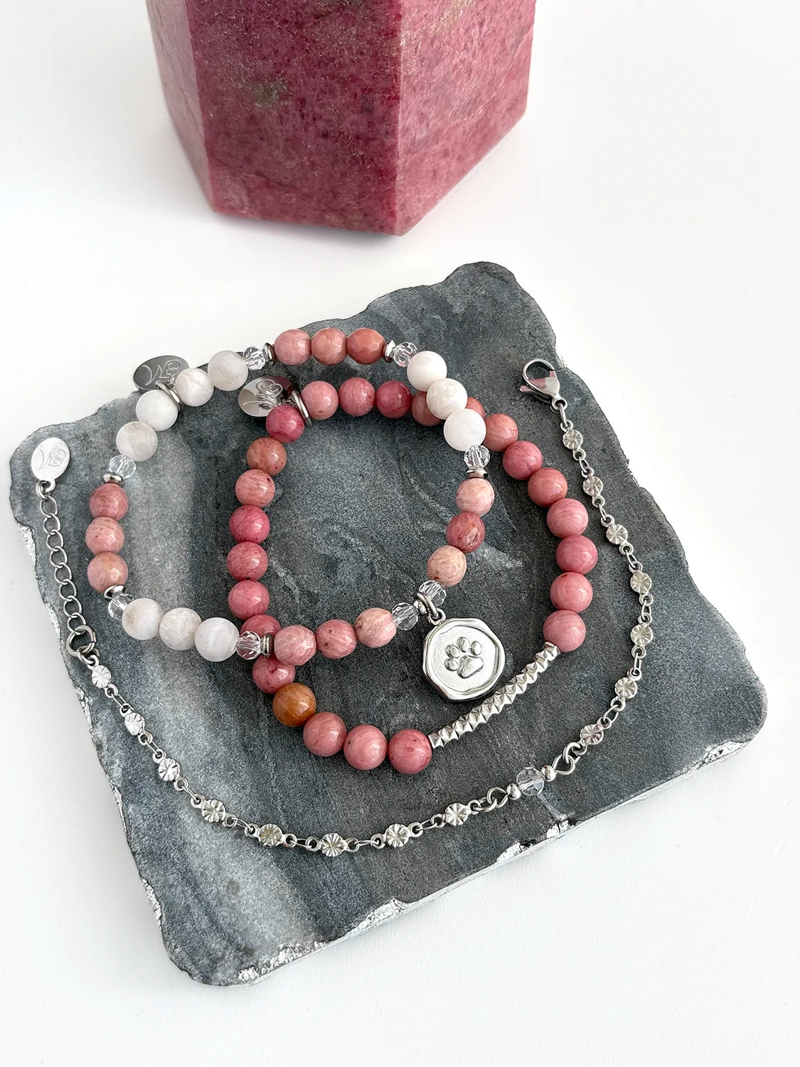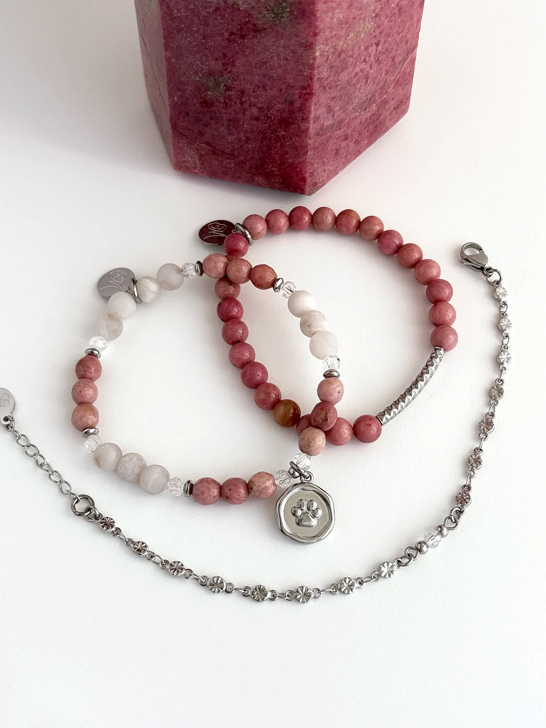 Les pierres fines de Rhodonite rose pâle et de Crazy Agate Lace couleur beige crème se marient parfaitement aux cristaux translucides pour refléter la tendresse infinie que nous apportent nos petits trésors chaque jour.